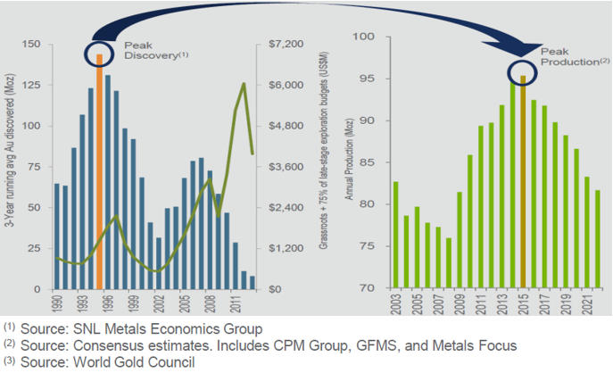 Wir sehen eindrucksvoll anhand der obenstehenden Charts wie die Gewinne der großen Goldproduzenten einbrachen. Selbst ohne Sonderposten wie Sonderabschreibungen sanken die Quartalsgewinne von über 4,2 Milliarden US-Dollar im 3. Quartal 2011 im Umfeld des Goldpreishochs auf -1,7 Milliarden US-Dollar im Schlussquartal 2013 und lagen auch im 3. Quartal 2015 trotz der vorübergehenden Goldpreiserholung bei -57 Millionen US-Dollar. Für das 4. Quartal 2015 liegen noch nicht alle Ergebnisse vor, aber der größte Goldproduzent Barrick Gold kam auf einen Verlust selbst unter Ausklammerung von Sonderabschreibungen und anderen Sonderposten in Höhe von 348 Millionen US-Dollar nach einem Gewinn von 137,5 Millionen US-Dollar im Vorquartal. Ein desaströses Bild ergibt sich im zweiten Chart, wenn wir die außerordentlichen Erträge und Aufwendungen wie Sonderabschreibungen berücksichtigen. Allein im 2. Quartal 2013 betrug der Verlust 18,4 Milliarden US-Dollar. In jedem Quartal des Jahres 2015 fielen Verluste an. Im 3. Quartal 2013 waren es 1,14 Milliarden US-Dollar. Für das Schlussquartal liegen noch nicht alle Daten vor, aber allein Barrick Gold kam auf einen Verlust von 2,6 Milliarden US-Dollar. Unser Fazit lautete daher: Die Goldpreise des 4. Quartals 2015 von unter 1100 US-Dollar je Feinunze reichen den großen Goldproduzenten nicht, um kostendeckend zu arbeiten. Auch wenn ein Rohstoffpreis für eine gewisse Zeit unter die Gewinnungskosten fallen kann, so bietet ein solches Umfeld wie beim Gold im Jahre 2015 hervorragende Chancen. Wären da noch die rückläufigen Neuentdeckungen von GoldHier zeigen wir einmal, dass im folgenden linken Chart 1995 die Neuentdeckungen von Gold im 3-Jahresdurchschnitt ihr Hoch erreichten. In der Ausgabe Januar 2016 des Gloom & Boom & Doom Report von Marc Faber wurde der Chart bis 2013 gezeigt. Hier der Ende 2015 publizierte Chart mit IST-Daten bis 2014: Demnach wird für 2015 ein Hoch der Goldförderung erwartet. Der Hochpunkt der Entdeckungen neuer Goldfunde im Jahre 1995 lässt einen Förderpeak im Jahre 2015 erwarten. Exakte Prognosen verbieten sich, aber der große Trend sollte aufgrund der starken Rückgänge der Neuentdeckungen stimmen. Der Rückgang des Goldgehalts je Tonne geht aus dem zweiten Chart dieses Abschnitts hervor. Auch ohne neue Dollarschwemme, die jedoch nur eine Frage der Zeit ist, stimmt das große Bild also für Gold. Genau zu diesem Thema veröffentlichte die Financial Times im Januar 2016 einen Artikel mit ähnlichem Inhalt. Zitiert wurde der Chef von Barrick Gold, der fallende Goldgehalte und Produktionsniveaus, einen Mangel an Neuentdeckungen und die Verlängerung des Zeitplans bei der Verwirklichung neuer Projekte sieht. Schauen wir uns auch den Verlauf der Investitionen der Goldminen im HUI-Goldminenindex an. Mit Ausnahme von Sibanye Gold sind alle HUI-Mitglieder berücksichtigt. Im 4. Quartal 2012 erreichten die Investitionen mit 6.390 Millionen US-Dollar ihr Hoch und im 3. Quartal 2015 waren sie auf nur noch 2.049 Millionen US-Dollar gesunken. Die Aussagen des Chefs von Barrick decken sich voll und ganz mit unseren Analysen, so dass der Wunsch hier nicht der Vater der Gedanken dieses Vertreters der größten Goldmine ist. Barrick förderte im 3. Quartal 2015 1,663 Millionen Goldunzen. Newmont, die wir aufgrund der Ertragslage vorziehen würden, kam auf 1,34 Millionen Unzen, Anglo Gold Ashanti auf 0,97 und Goldcorp auf 0,92 Millionen Unzen, um einige Flaggschiffe der Branche zu nennen. In unserem Silberbulletin vom 23. Januar 2016 schrieben wir daher treffend: "In Indexpunkten lag der HUI mit 99,19 am 19. Januar 2016 so niedrig wie seit Juli 2002 nicht mehr. Dies liegt daran, dass heute weit mehr Aktien von den Unternehmen herausgegeben sind als damals." Und wir zogen unser Fazit: "Unseres Erachtens sollte die Marke von 90 bis 100 eine starke Unterstützung sein. Wenn der Goldpreis hier dreht, verfügen die Goldminen über eine Hebelwirkung. Denn aus Verlusten werden bei steigenden Goldpreisen schnell Gewinne." Bis zum 27. Februar 2016 konnte der HUI-Goldindex auf 172,71 Punkte zulegen. Sie sehen, dass auch mit Goldminenaktien noch Geld verdient werden kann. Wenden wir uns den Förderkosten für Silber zuWir bilden unten einen Chart ab, der die Cash Costs nach einer Analyse aller primären Silberproduzenten durch das Analysehaus CPM zeigt. Diese beinhalten direkte Förderkosten, Verhüttungs-, Raffinierungs- und Transportkosten, Arbeitskosten, Strom- sowie Energiekosten und sonstige direkte Kosten. Es handelt sich nicht um die sogenannten Total Cash Costs, die auch noch die buchhalterischen Kosten wie z. B. Verwaltungskosten, Abschreibungen auf Maschinen, Förderabgaben, Steuern auf die Produktion enthalten. Kennen Sie den Begriff der Grenzkosten oder auch Marginalkosten? Hier geht es darum, welche Kosten durch die Produktion einer zusätzlichen Mengeneinheit eines Produktes, hier eines Rohstoffes, entstehen. Nun zeigen wir im folgenden Chart neben den Durchschnittskosten das 90. Perzentil der Förderkosten. Was verbirgt sich dahinter? Es gibt an, dass 90 Prozent der Silberförderung mit Kosten unterhalb des 90. Perzentils und 10 Prozent oberhalb stattfinden. Die Rohstoffteams beispielsweise der Deutschen Bank oder der Societe Generale konzentrieren sich auf diesen Wert. Denn nach ihren Untersuchungen ist er ein gutes Hilfsmittel, um zu erkennen, ab wann zumindest mittelfristig Fördereinschränkungen erfolgen können. Dies heißt allerdings nicht, dass ein Rohstoff nicht zeitweilig unter dieses 90. Perzentil fallen kann. Der unten abgebildete Chart zeigt uns wie bereits ausgeführt nur die Cash Costs. Den Chart haben wir auf Basis der jährlichen Untersuchungen des Analysehauses CPM erstellt. Wir sehen, dass der Silberpreis am 28. Oktober 2008 dem 90. Perzentil zwar gefährlich nahe kam, die Marke jedoch nicht (!) unterschritt. Damals hatten wir es allerdings mit einem gewaltigen Deflationsschock, dem Desaster für die Weltwirtsch