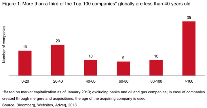 Gold und Silber haben einen ungeheuren Vorteil: Sie verbriefen kein Schuldversprechen eines Dritten und können daher nicht in Konkurs gehen. Die Welt badet in einem Ozean voller Schulden. Denn wenn Sie bei Ihrer Bank auf Ihrem Konto ein Guthaben besitzen, schuldet Ihnen die Bank Geld. Besitzen Sie eine Anleihe der Deutschen Bank, ist die Bank Ihr Schuldner. Kaufen Sie eine Staatsanleihe der Bundesrepublik Deutschland, ist der Staat derjenige, der Ihnen ein Schuldversprechen gibt. Die Staaten sitzen heute in immer höheren Schuldentürmen. Voltaire sagte einmal: "Papiergeld zieht sich immer auf seinen inneren Welt zurück - nämlich null". Bei einer Inflation schwindet die Kaufkraft des Papiergeldes. Die Schulden werden praktisch "weginflationiert". Bei einer Deflation steigt die Kaufkraft des Papiergeldes. Viele Schuldner können dann ihre aufwertenden Schulden nicht mehr zurückzahlen und gehen in Konkurs. Daher sagte der Bankier Fürstenberg vor langer Zeit: "Inflation und Deflation sind nur zwei Fremdworte für Pleite". Die Schuldversprechen verschwinden in beiden Fällen. Auch Aktien sind wie Anleihen nichts für die EwigkeitNachfolgend zeigen wir Ihnen die Ergebnisse einer Studie aus dem Jahre 2013. Demzufolge sind nur 35 der größten Aktiengesellschaften älter als 100 Jahre. 36 der Top-Unternehmen sind jedoch jünger als 40 Jahre, 16 sogar jünger als 20 Jahre.