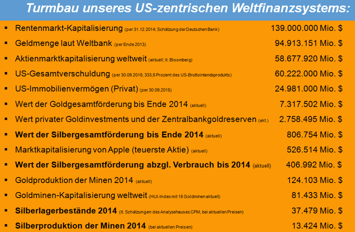 Die Vorzüge von Silber gegenüber GoldDas erste Buch von Thorsten Schulte trug den Titel "Silber - das bessere Gold" und kam rechtzeitig zur Silberhausse 2010/11 auf den Markt. Leider werden die meisten Anleger immer erst dann auf ein Thema und eine Vermögensklasse aufmerksam, wenn es in aller Munde ist. Als Thorsten Schulte im April 2011 in vielen Medien präsent war, sprach er wenige Tage vor dem Einbruch des Silberpreises in der Frankfurter Allgemeinen Zeitung eine Warnung aus. Zu dieser Zeit badeten viele Silberinvestoren in Euphorie und Gewinnen. Antizyklisches Investieren ist sein Credo. "Nur tote Fische schwimmen mit dem Strom", pflegt Thorsten Schulte stets zu sagen und fügt gern hinzu: "Wer zur Quelle will, muss gegen den Strom schwimmen." In unserer Sonderstudie "Silber - das bessere Gold" (im Sommer wird unseren Abonnenten ein umfassendes Update zur Verfügung gestellt) und in den bekannten Büchern werden viele Vorzüge von Silber benannt. Wir schicken voraus, dass es nicht darum gehen sollte, alles in Gold oder alles in Silber anzulegen. Für uns geht es nicht um ein Entweder/Oder, sondern um ein Sowohl-als-auch. Wir beschränken uns hier bewusst auf drei Vorzüge gegenüber Gold. Beachten Sie bitte den großen Langfristchart zum Silberpreis am Ende dieser Wissensbox! Silber wird verbraucht, während Gold gehortet wirdIm Jahr 2014 lag das Goldangebot bei 4.362 Tonnen. Davon verbrauchte die Industrie nur 400 Tonnen und damit gerade einmal 9 Prozent. Silber hingegen ist nicht nur Edelmetall, sondern auch Industriemetall. Im Jahr 2014 konsumierte die Industrie 52 Prozent des gesamten Angebots und einschließlich des Silberverbrauchs in der Photographie waren es 56 Prozent. Auf Silberschmuck entfielen weitere 20 Prozent und auf Tafelsilber rund 6 Prozent. 108 Millionen Silberunzen wanderten als Silbermünzen und -medaillen in die Tresore der Investoren, was rund 10 Prozent des Silberangebots entspricht. Silber wird verbraucht, während Gold gehortet wird.Bis Ende 2014 wurden laut dem Analysehaus CPM 52,748 Milliarden Unzen Silber in der Menschheitsgeschichte gefördert. Davon gingen über 26 Milliarden Unzen verloren. Die Vorräte von Silbermünzen und Barren werden auf gerade einmal 2,4 Milliarden Unzen geschätzt. Die Anleihenblase ist die größte Blase von allen mit 139.000 Milliarden bzw. 139 Billionen US-Dollar. Im Vergleich dazu ist der Wert der Goldinvestments der privaten Investoren und der Zentralbanken von gerade einmal 2,8 Billionen US-Dollar bescheiden. Der Wert der oberirdischen Silberlager von rund 2,4 Milliarden Unzen ist dagegen mit noch nicht einmal 38 Milliarden US-Dollar winzig. Die Nachfrage der Silbernachfrage ist dabei getragen von vielen verschiedenen Segmenten. Bei Platin lag 2015 die Nachfrage für Autokatalysatoren allein bei 44,5 Prozent der Gesamtnachfrage und bei Palladium waren es laut Johnson Matthey sogar stolze 79,5 Prozent, nämlich 7,457 Millionen Unzen bei einer Gesamtnachfrage von 9,376 Millionen Unzen. Was geschieht beispielsweise, wenn der Verbrennungsmotor vollständig durch die Brennstoffzelle und/oder Elektrofahrzeugen ersetzt wurde? Silber steckt in jedem Auto, wobei es in einem Luxuswagen rund 2 Unzen sind. Das weiße Metall wird in der Elektronik verwendet, wird in der Solarindustrie genutzt, Silbernanodrähte spielen eine Rolle bei der Herstellung biegsamer Bildschirme, es steckt in RFID-Chips und so weiter. Silber leitet Wärme und Elektrizität am besten unter allen Metallen. Dank des hervorragenden Reflexionsvermögens werden durch das Versilbern von Glas Spiegel hergestellt. Noch dazu wirkt Silber keimtötend und wird in der Lebensmittelhygiene und der Medizin benutzt. Silber bietet den besten Inflationsschutz